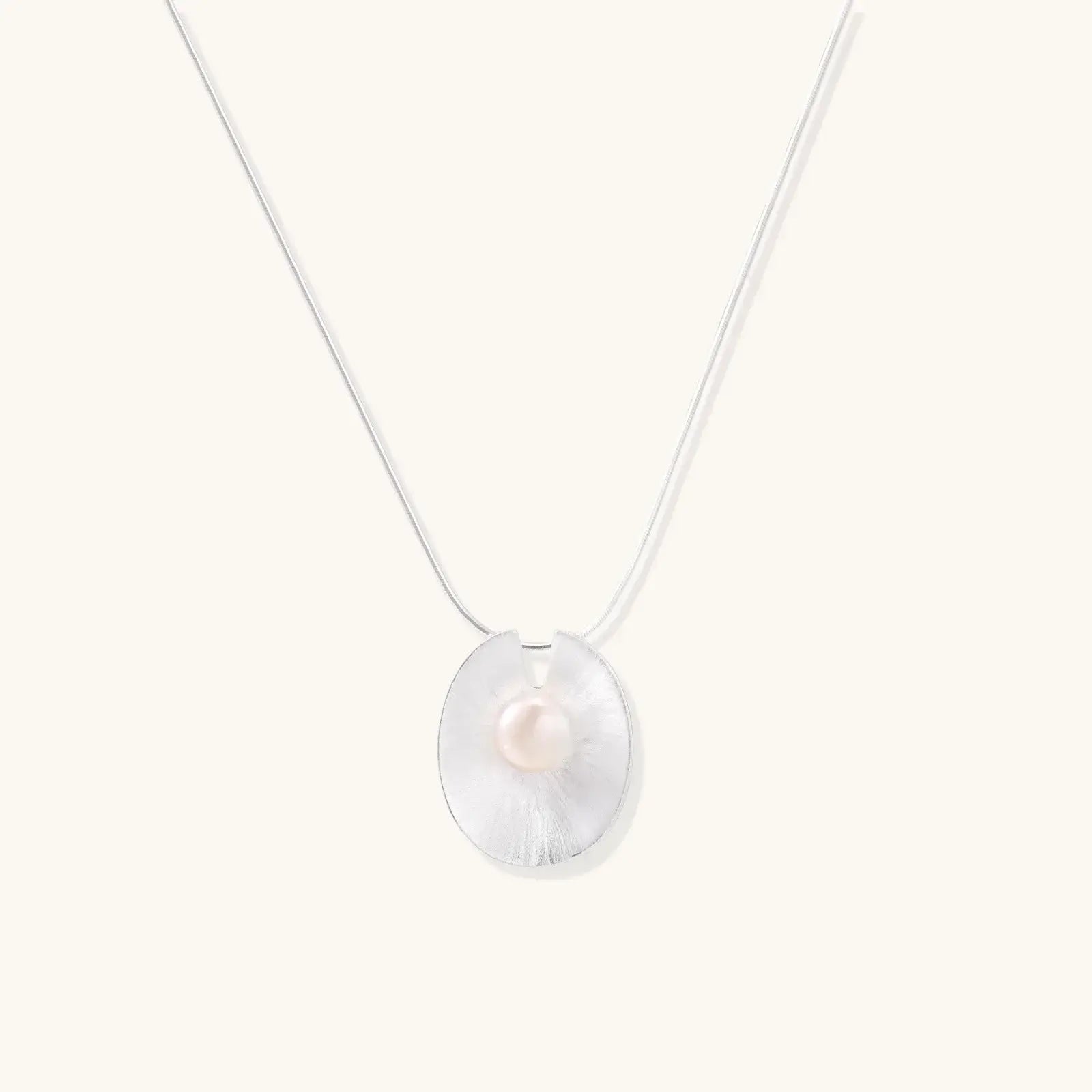 A brushed sterling silver disc cradles a luminous freshwater pearl—known for nurturing feminine energy—creating that effortlessly refined vibe.