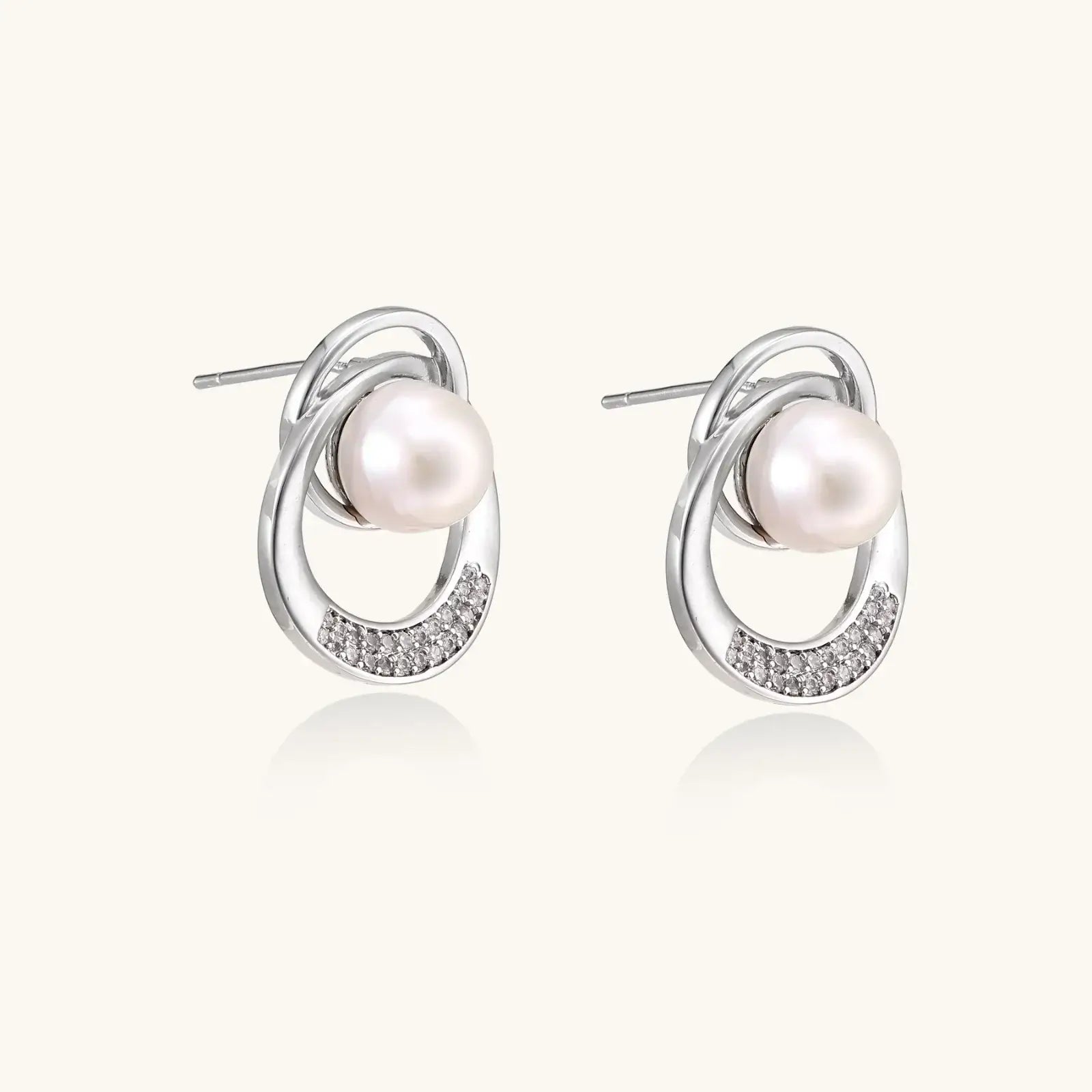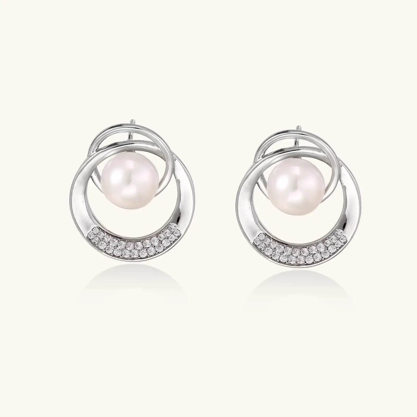 White gold-plated brass earrings with circular design, freshwater pearl center, and diamond accents