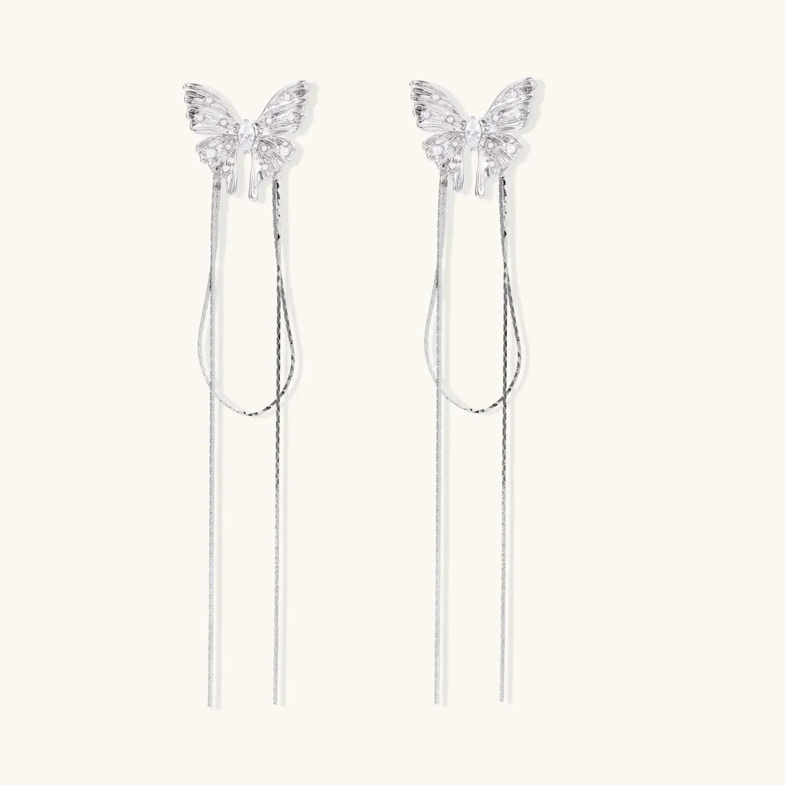 Delicate zirconia butterflies perch atop cascading silver threads that sway with your every move.