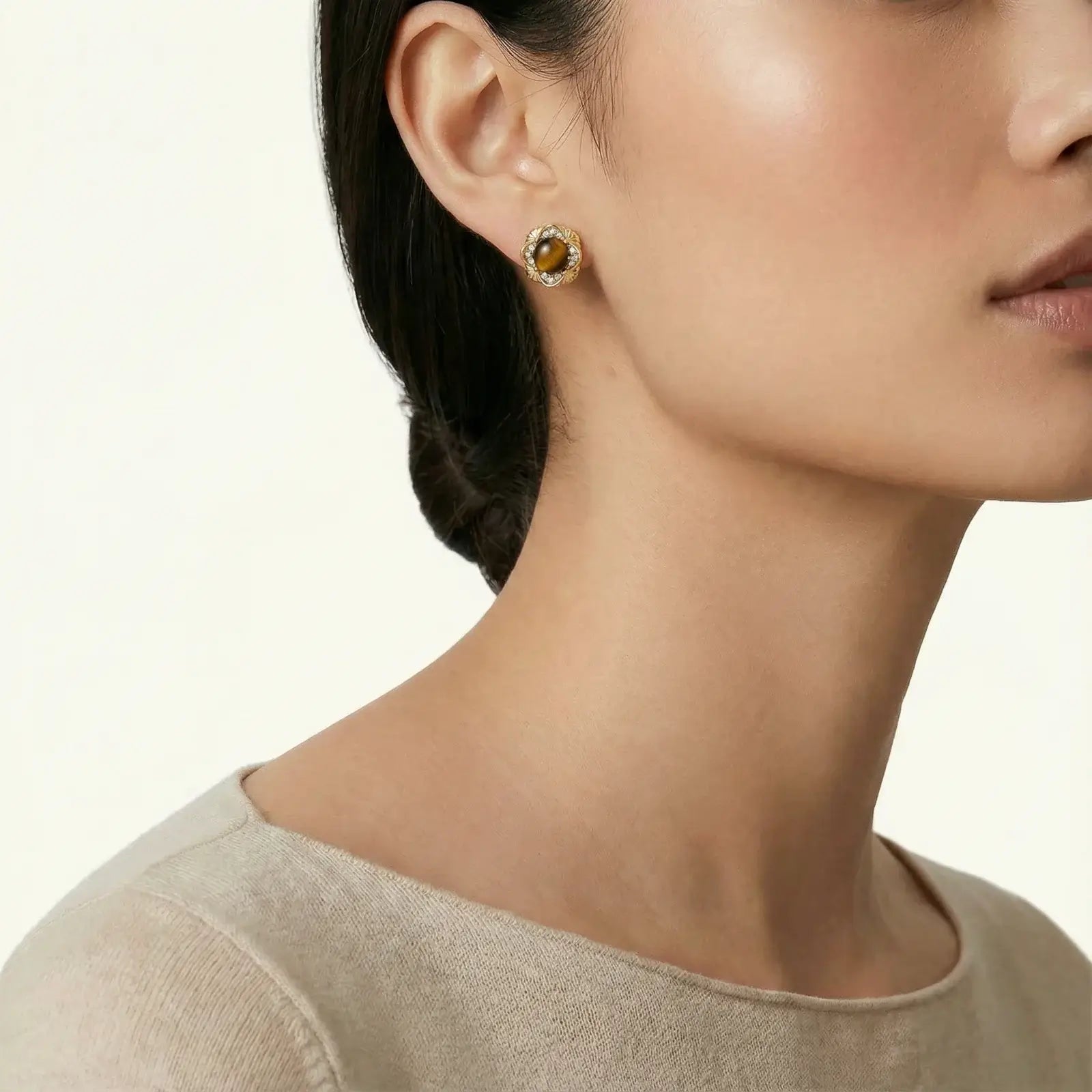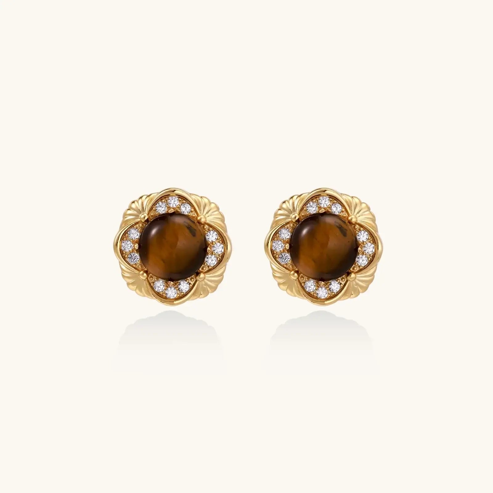 Ornate gold petals frame grounding tiger's eye stones in these vintage-inspired studs that channel old-money elegance.