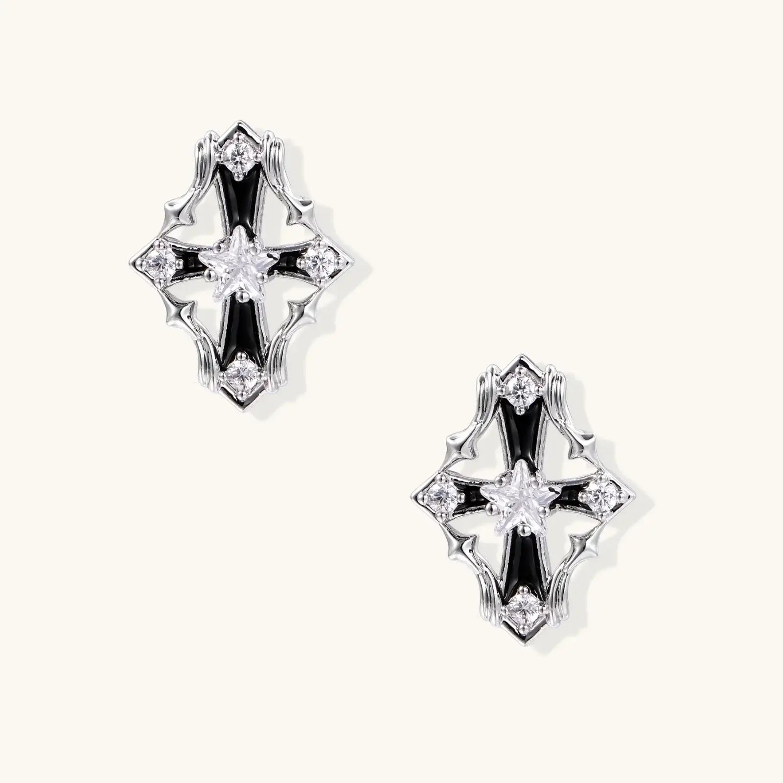 Architectural drama meets everyday edge. White gold-plated studs with star-cut zirconia and glossy black enamel geometry—these are your non-negotiable bold moment for gallery openings or that girl energy at brunch hangs.