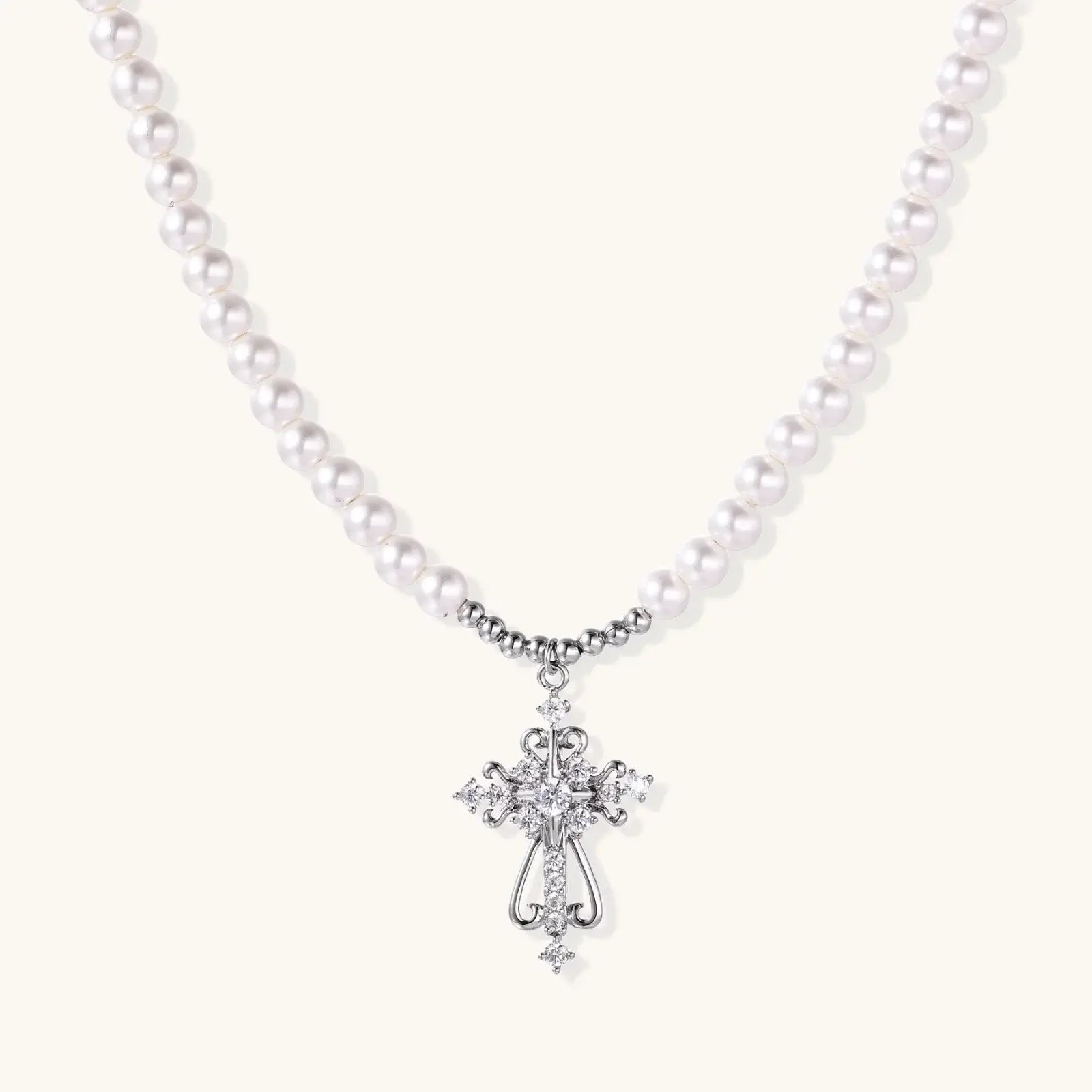 White pearl beaded necklace with ornate crystal-embellished cross pendant on white background, white gold plated finish