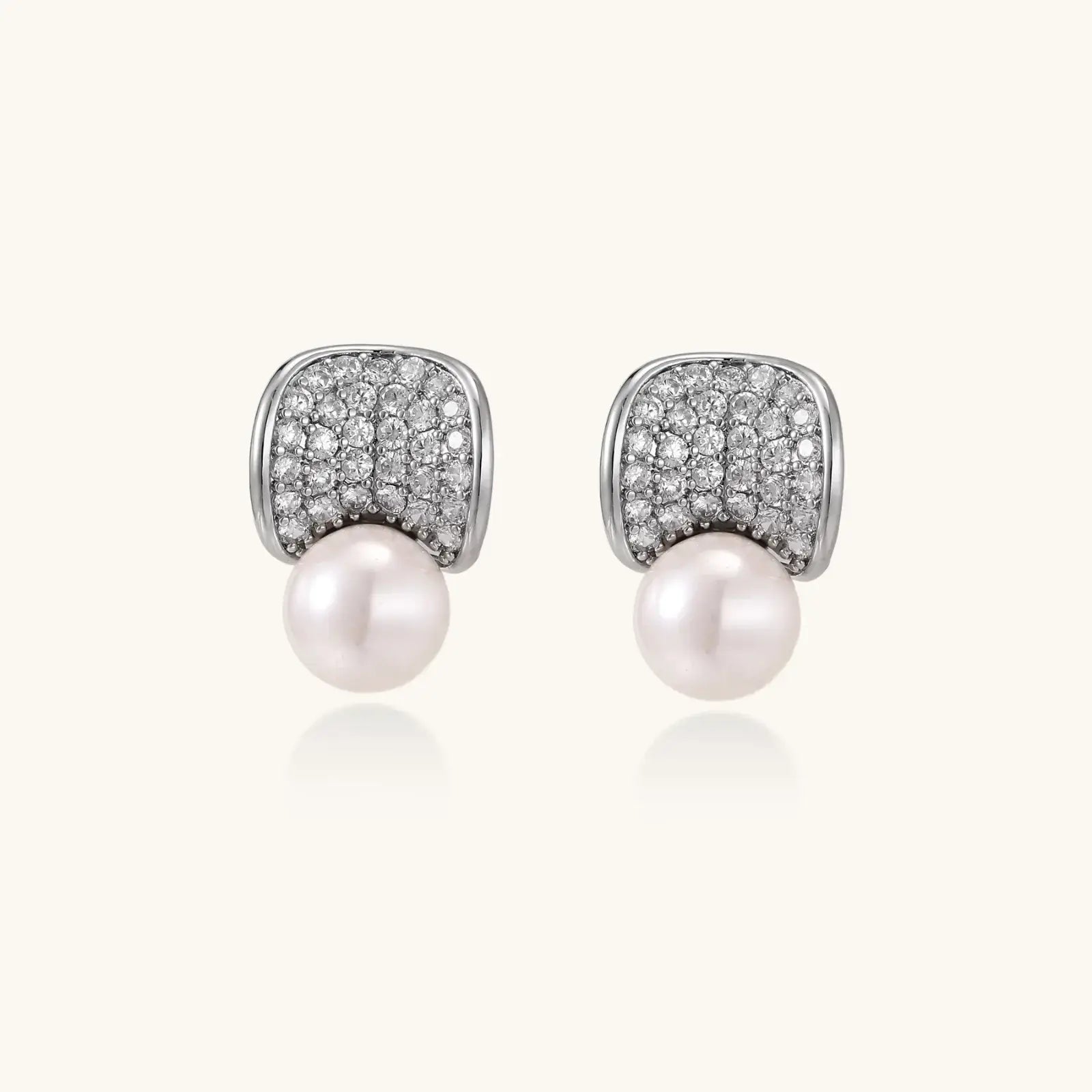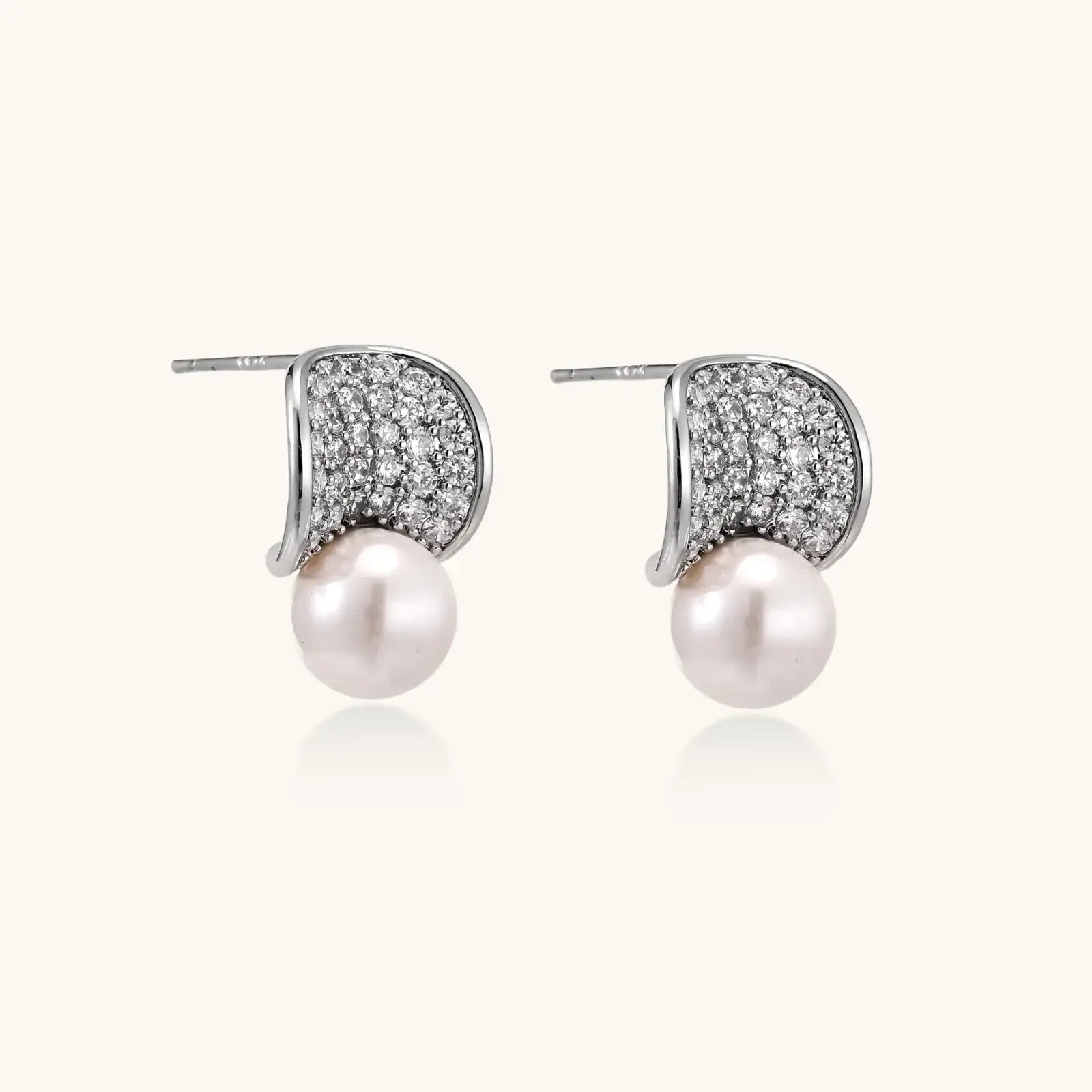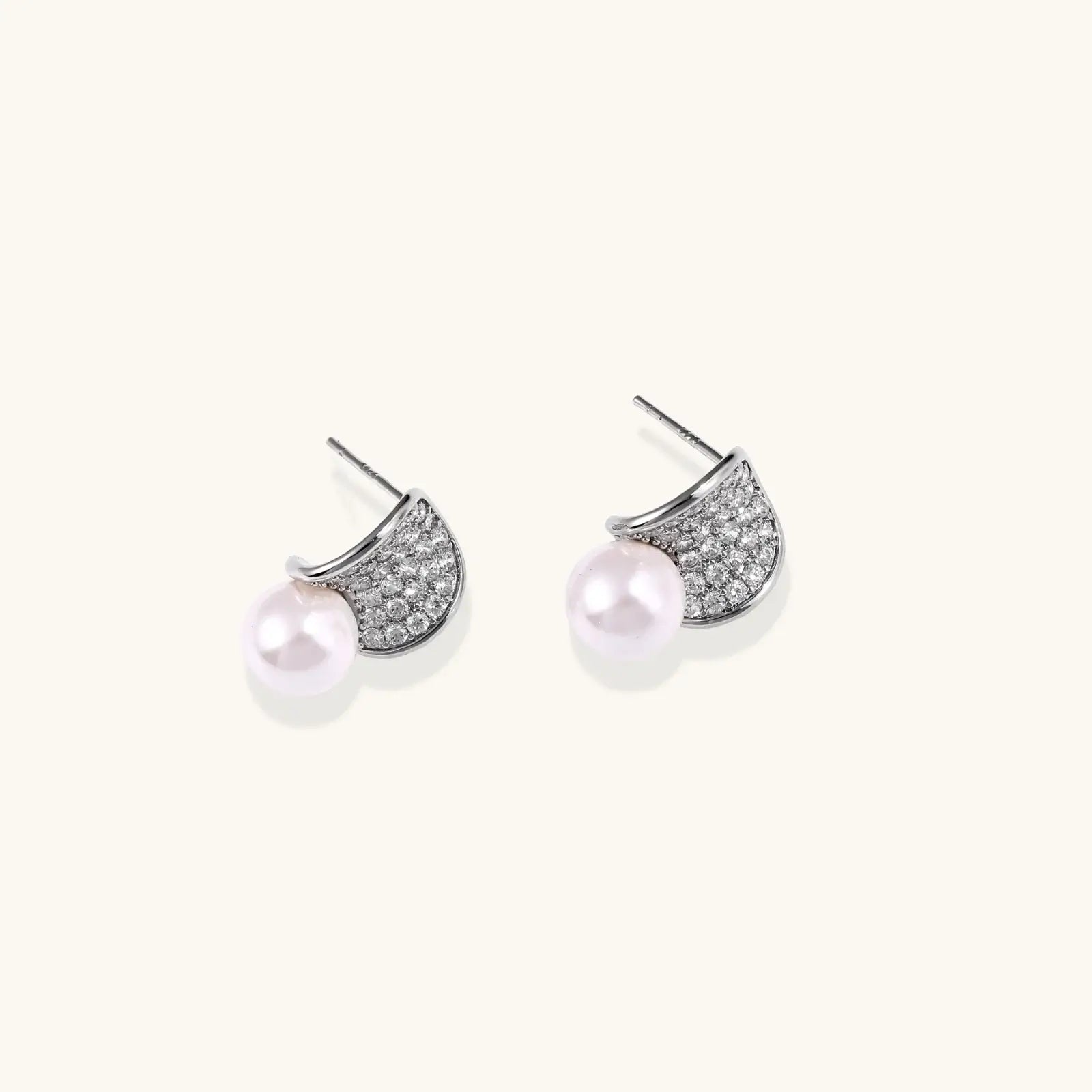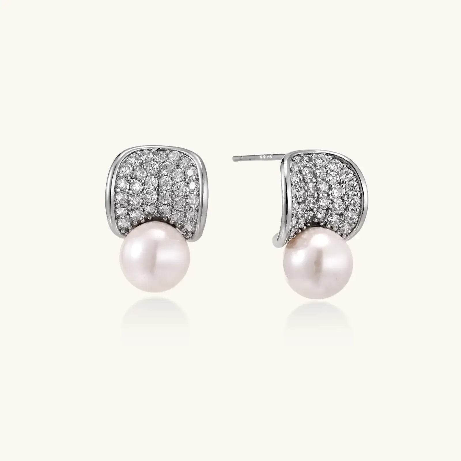 Curved pavé diamond studs in white gold-plated brass cradle lustrous freshwater pearls against cream background
