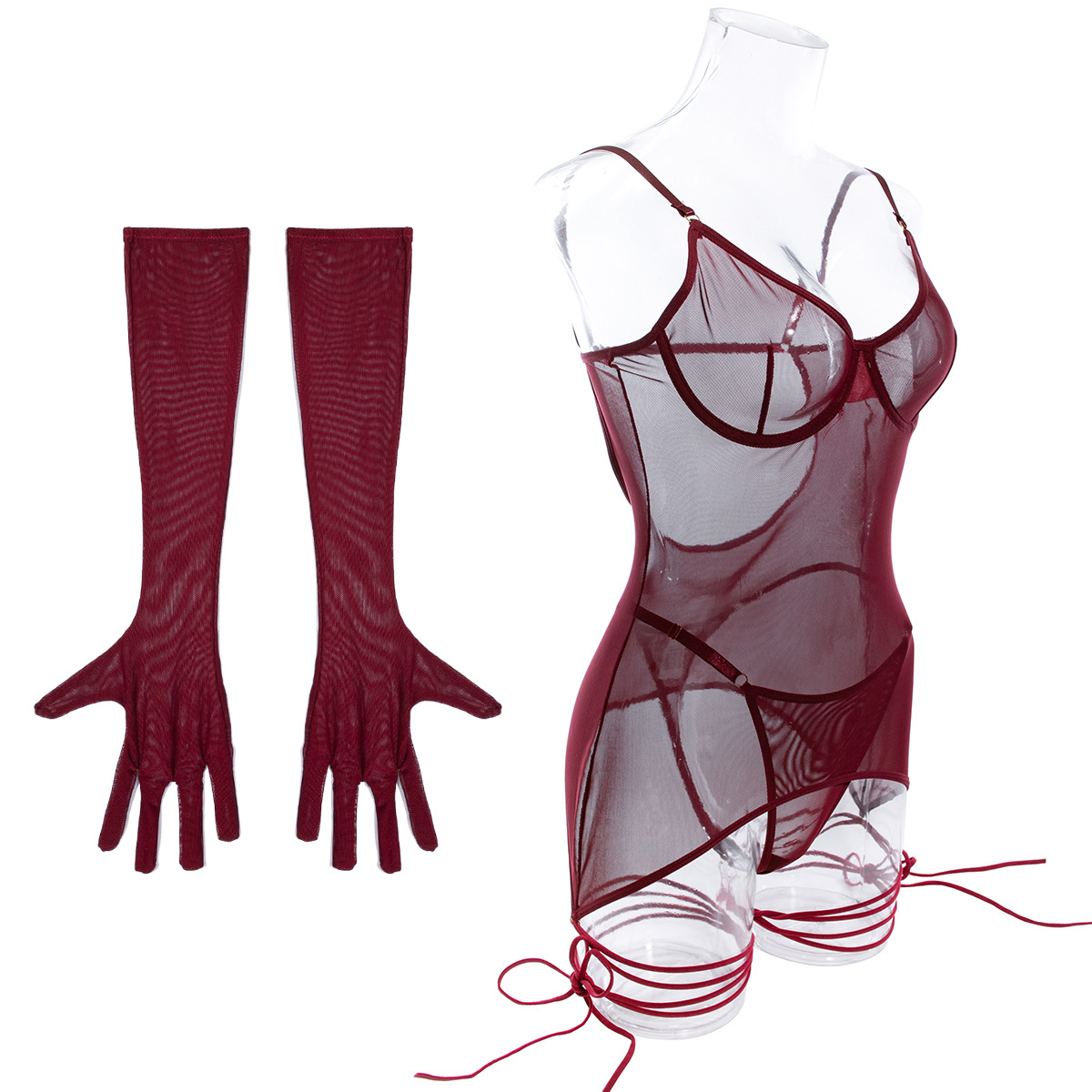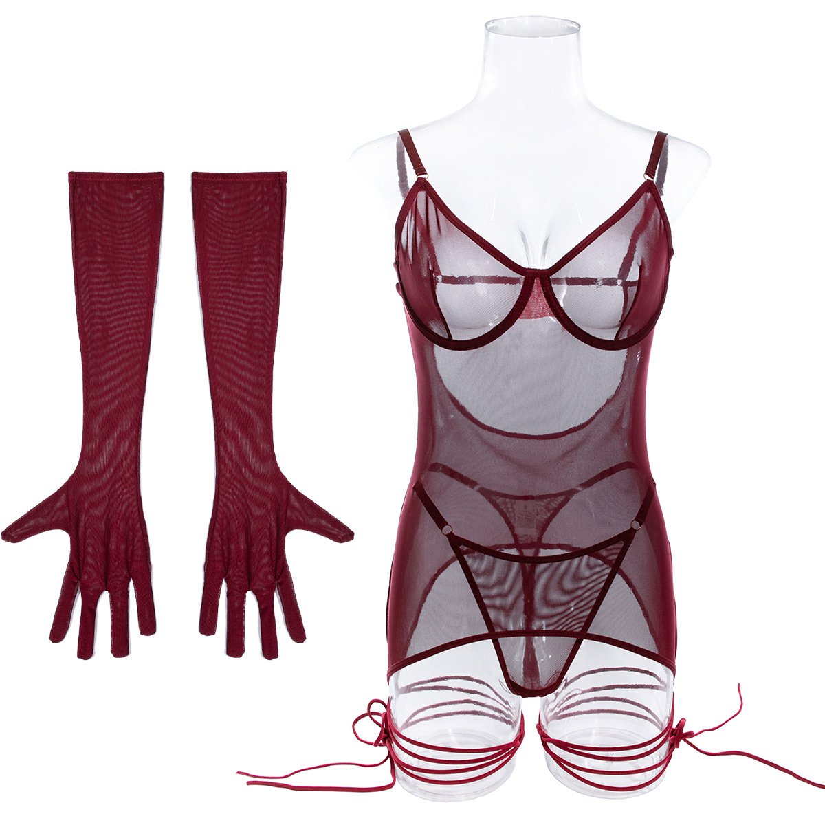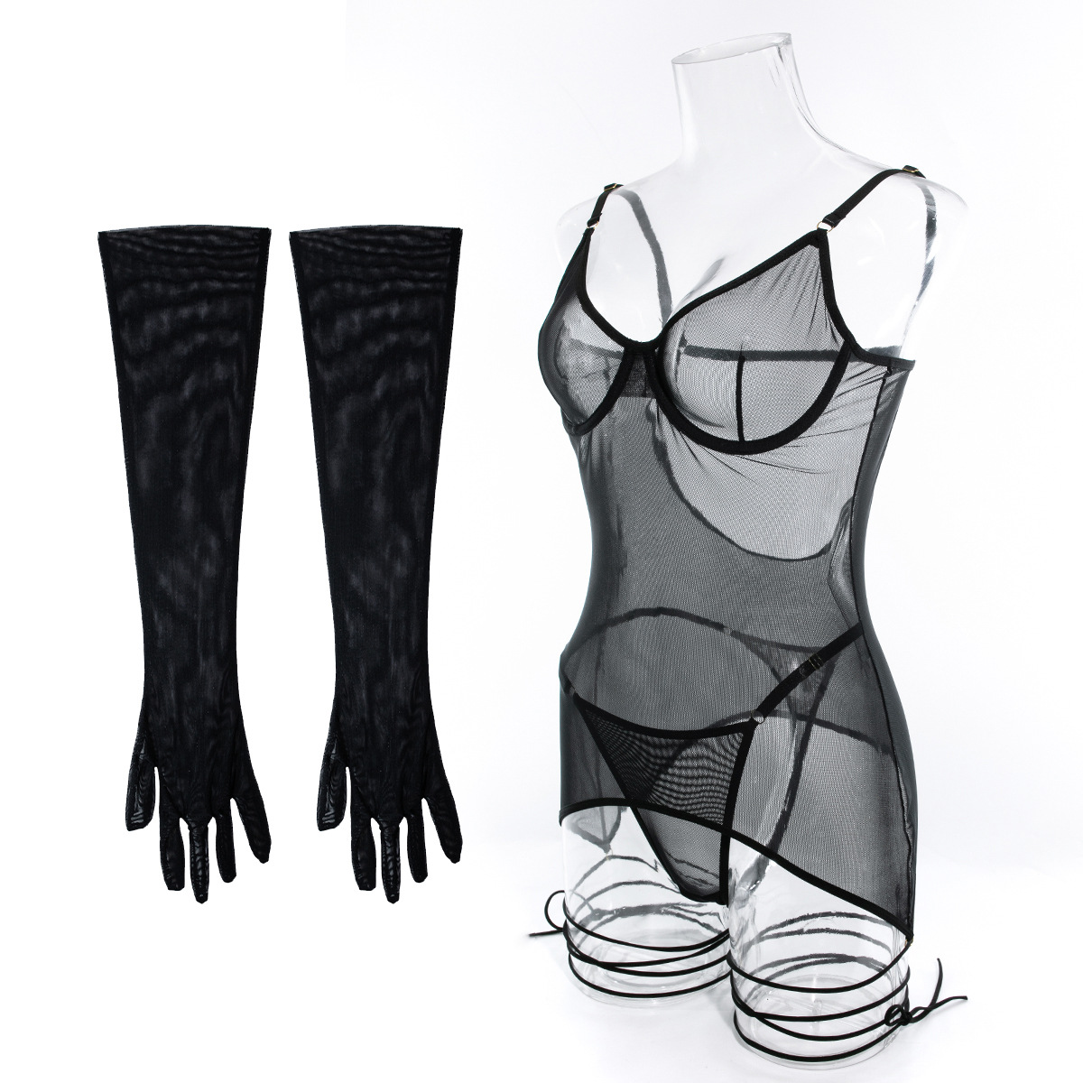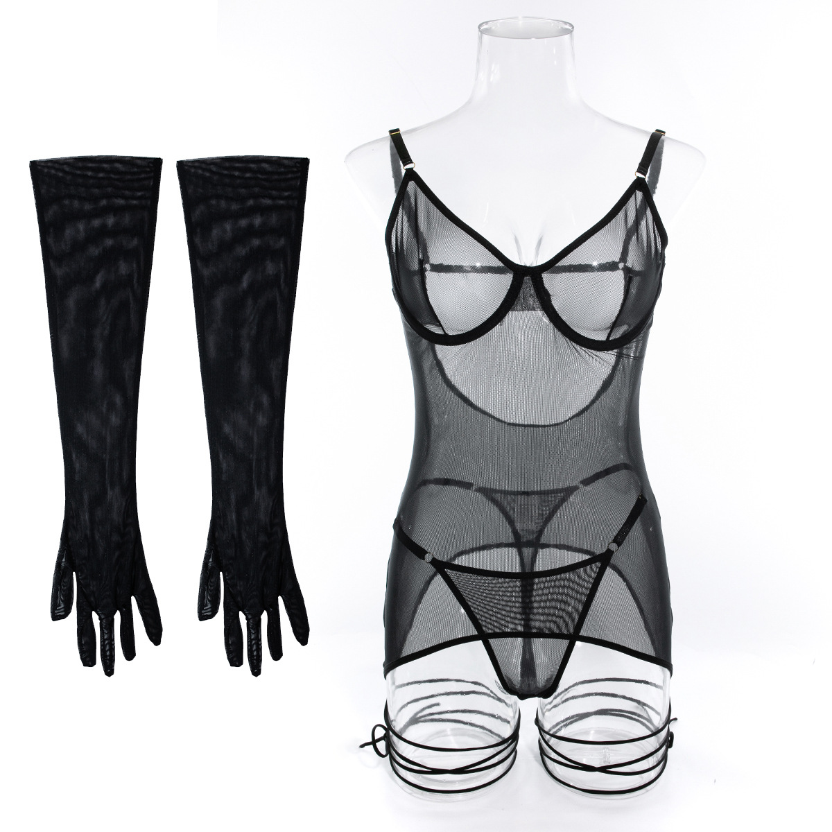 Seductive Lace Lingerie Full Set with Gloves & Nightwear - Push-Up Underwire Sexy Mesh Outfit