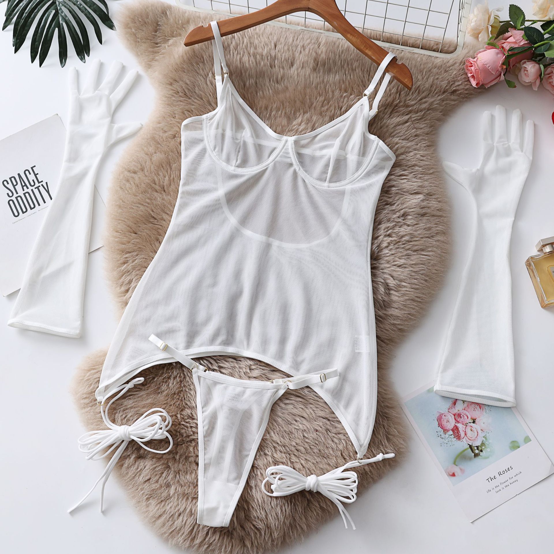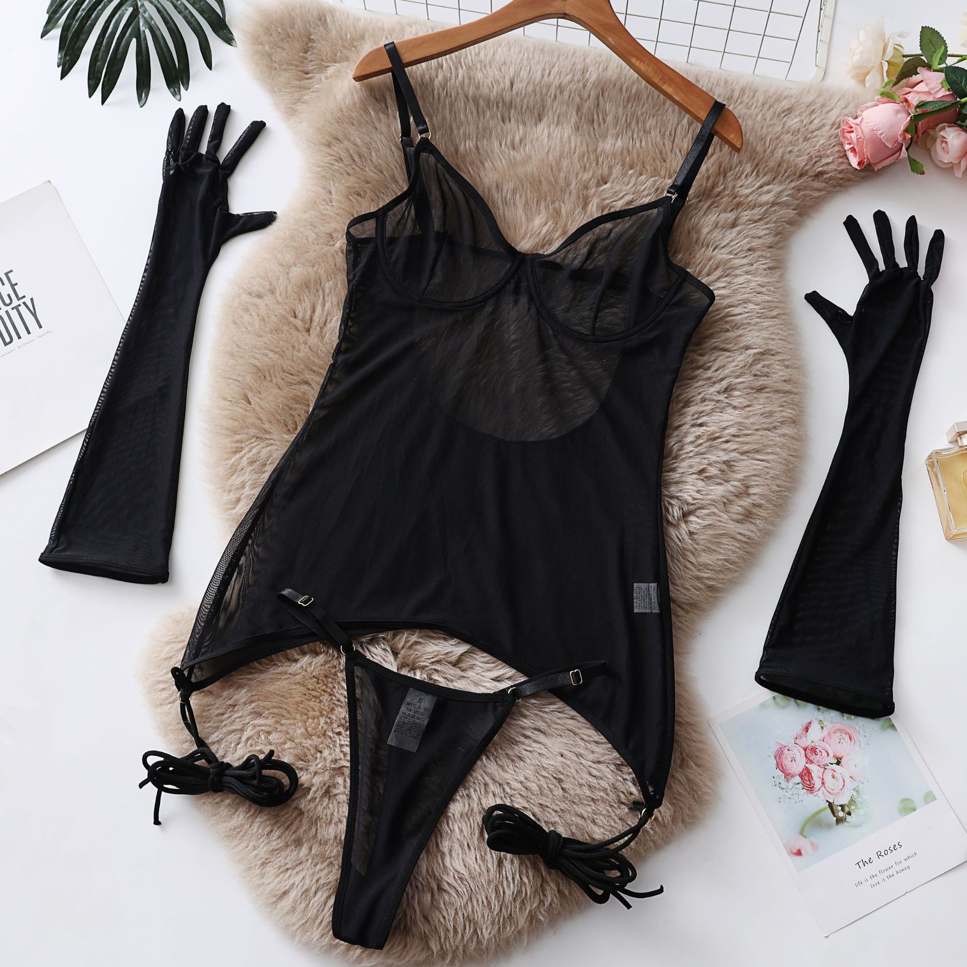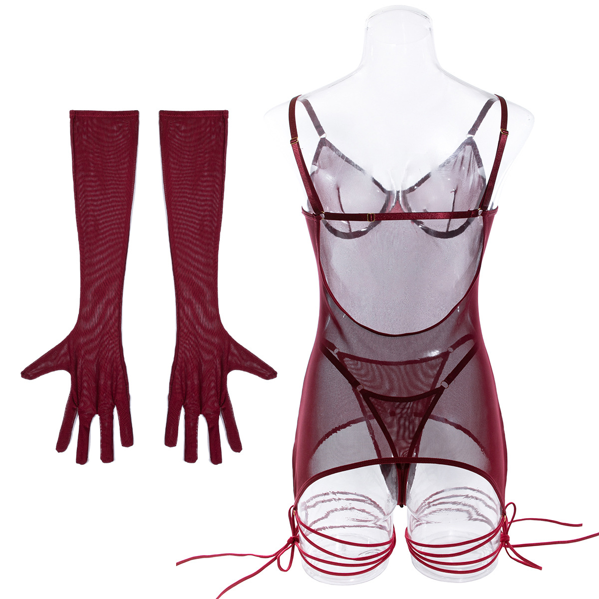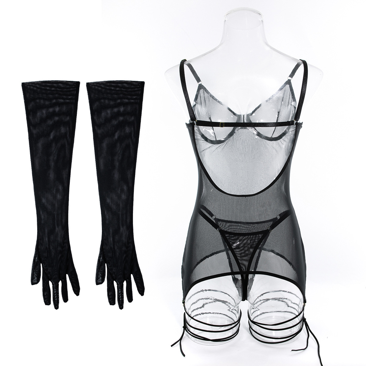 Seductive Lace Lingerie Full Set with Gloves & Nightwear - Push-Up Underwire Sexy Mesh Outfit