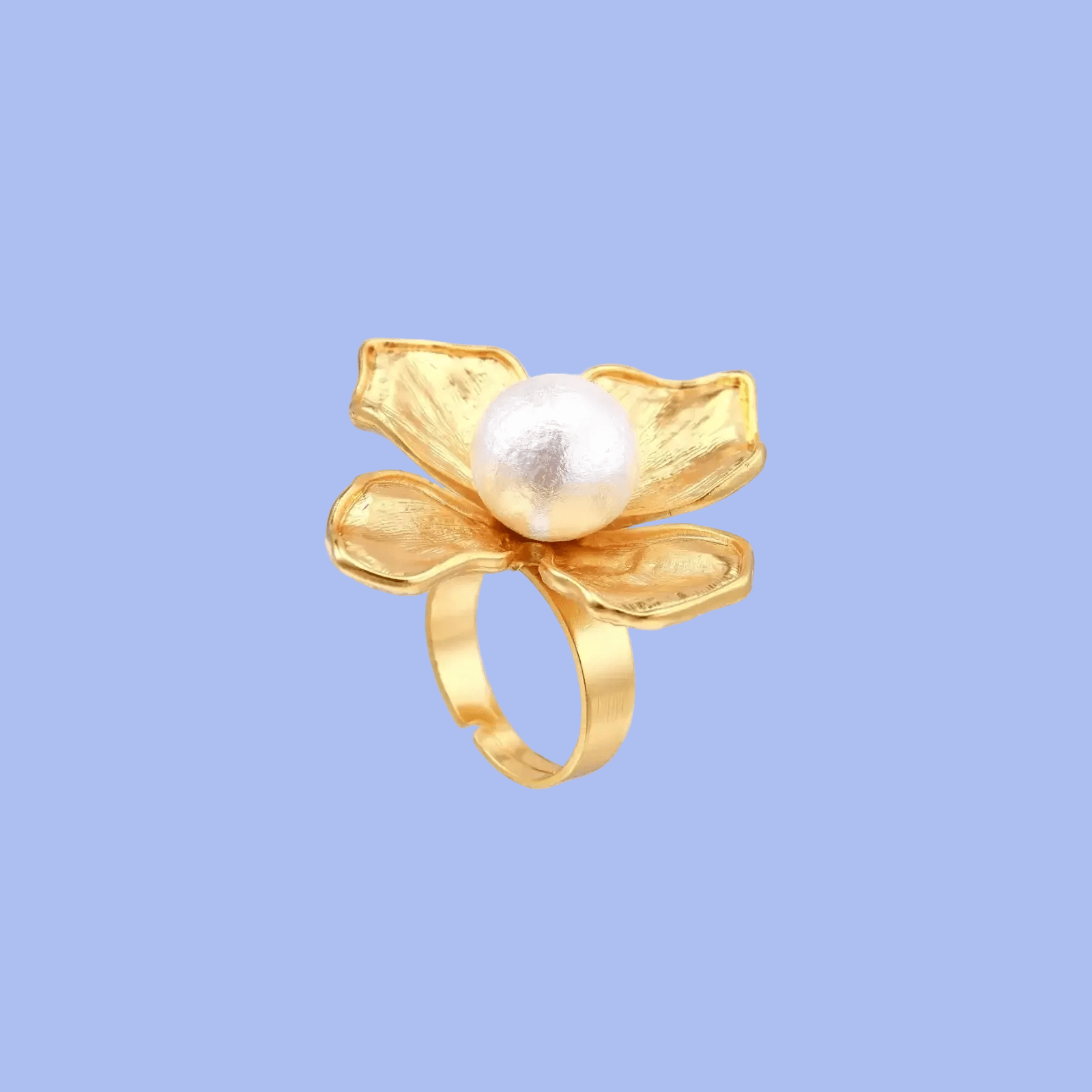 Gold-plated flower ring with textured petals and white cotton pearl center on cream background