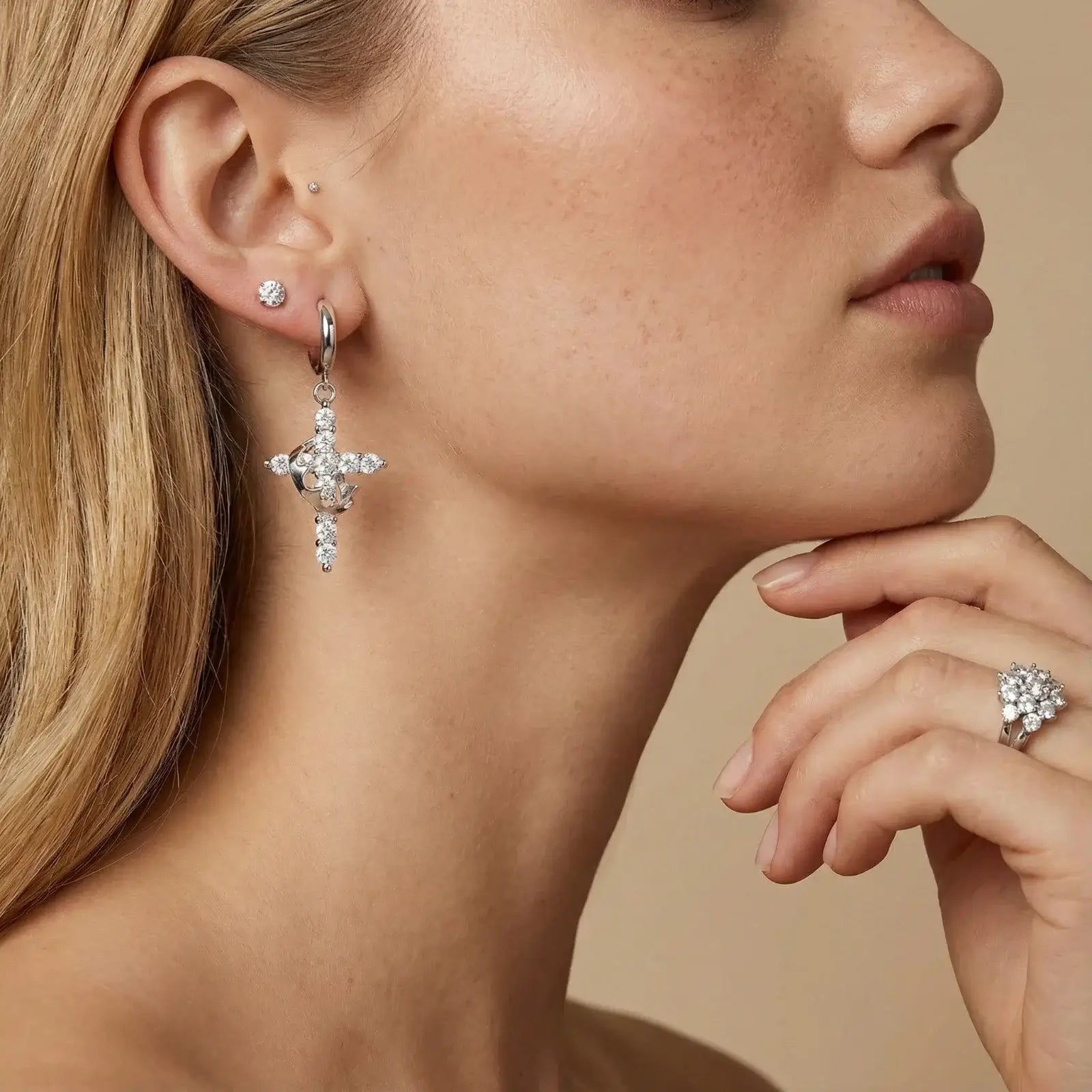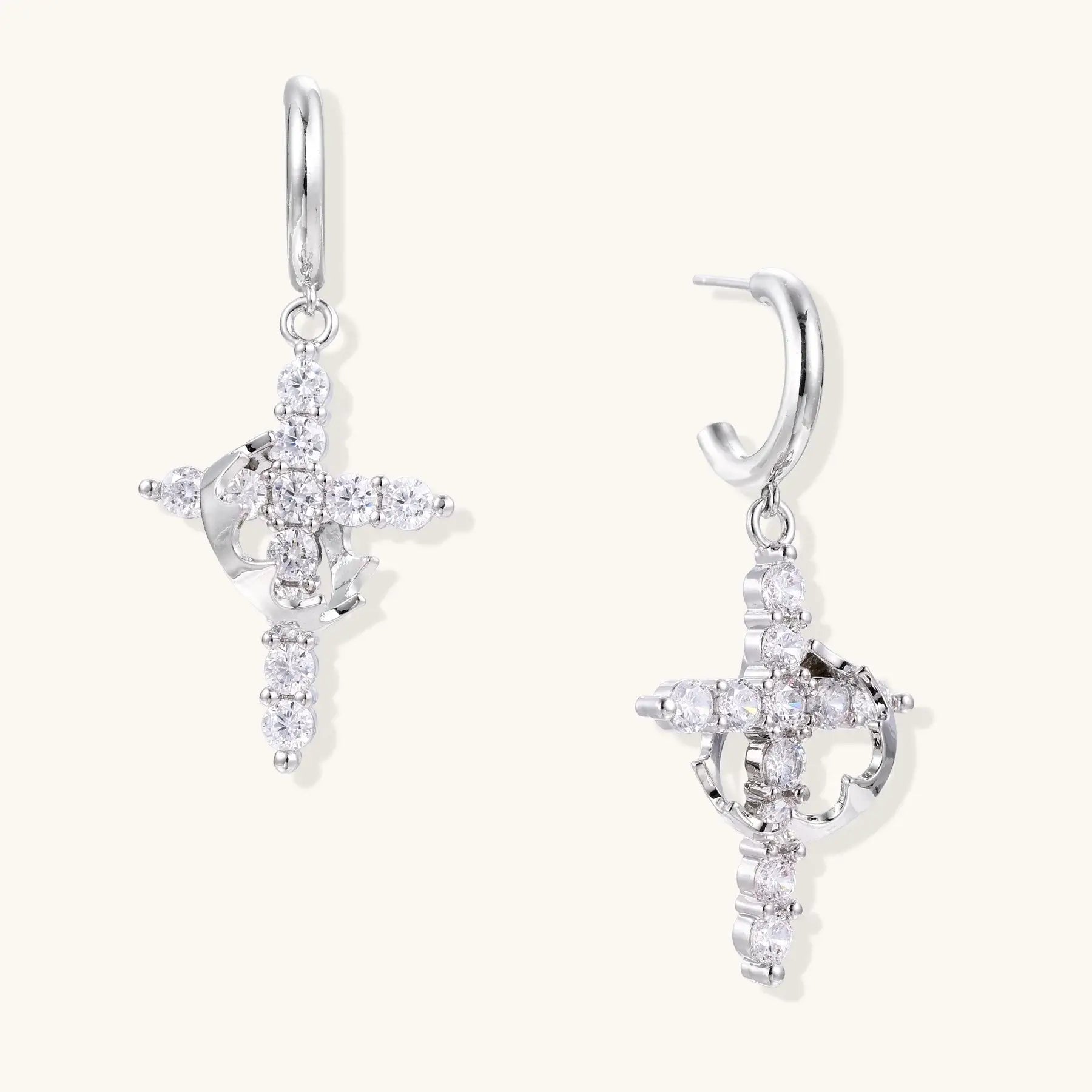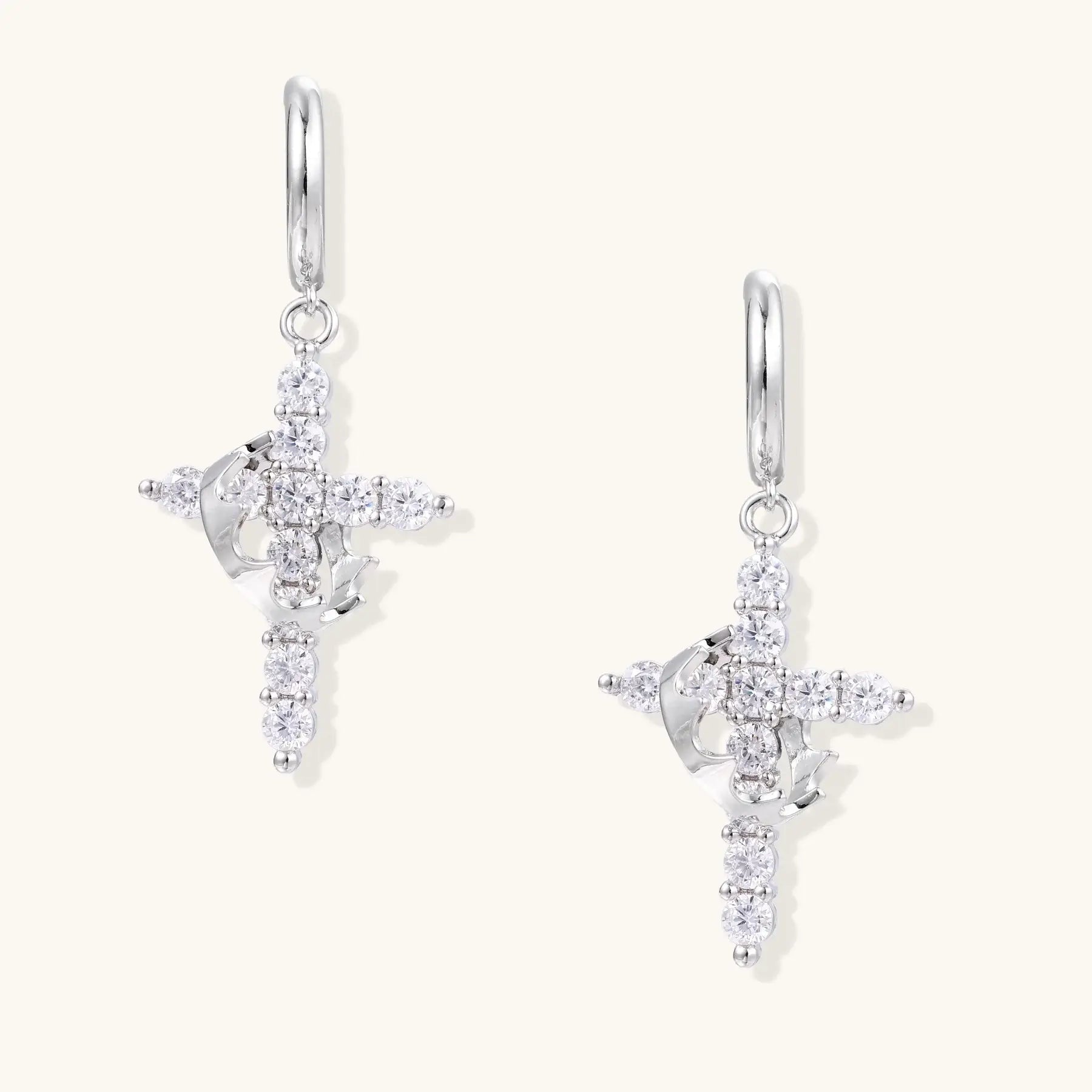 Celestial cross charms meet delicate hoops in these white gold-plated stunners with brilliant zirconia stones—silver tones enhance intuition and emotional balance.