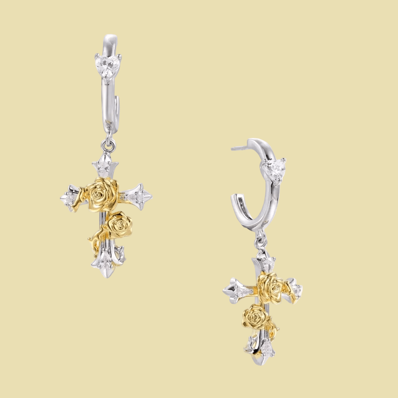 Gothic romance meets spiritual armor in these dual-rose cross earrings, where 18K gold-plated roses—channeling confidence and warmth—embrace zirconia-studded silver.