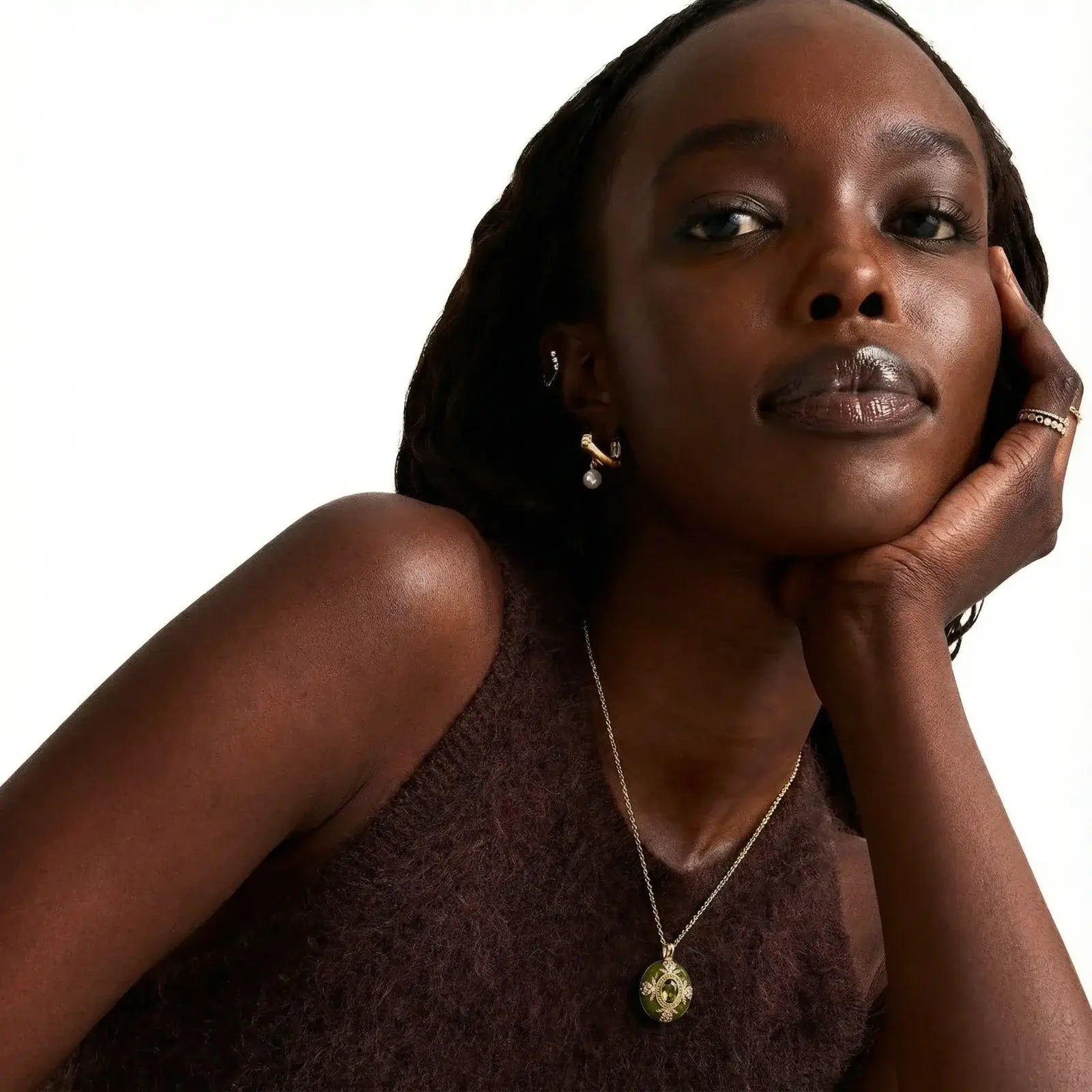 Gold-plated luxury meets emerald enamel in this vintage-inspired pendant that channels confidence and warmth.