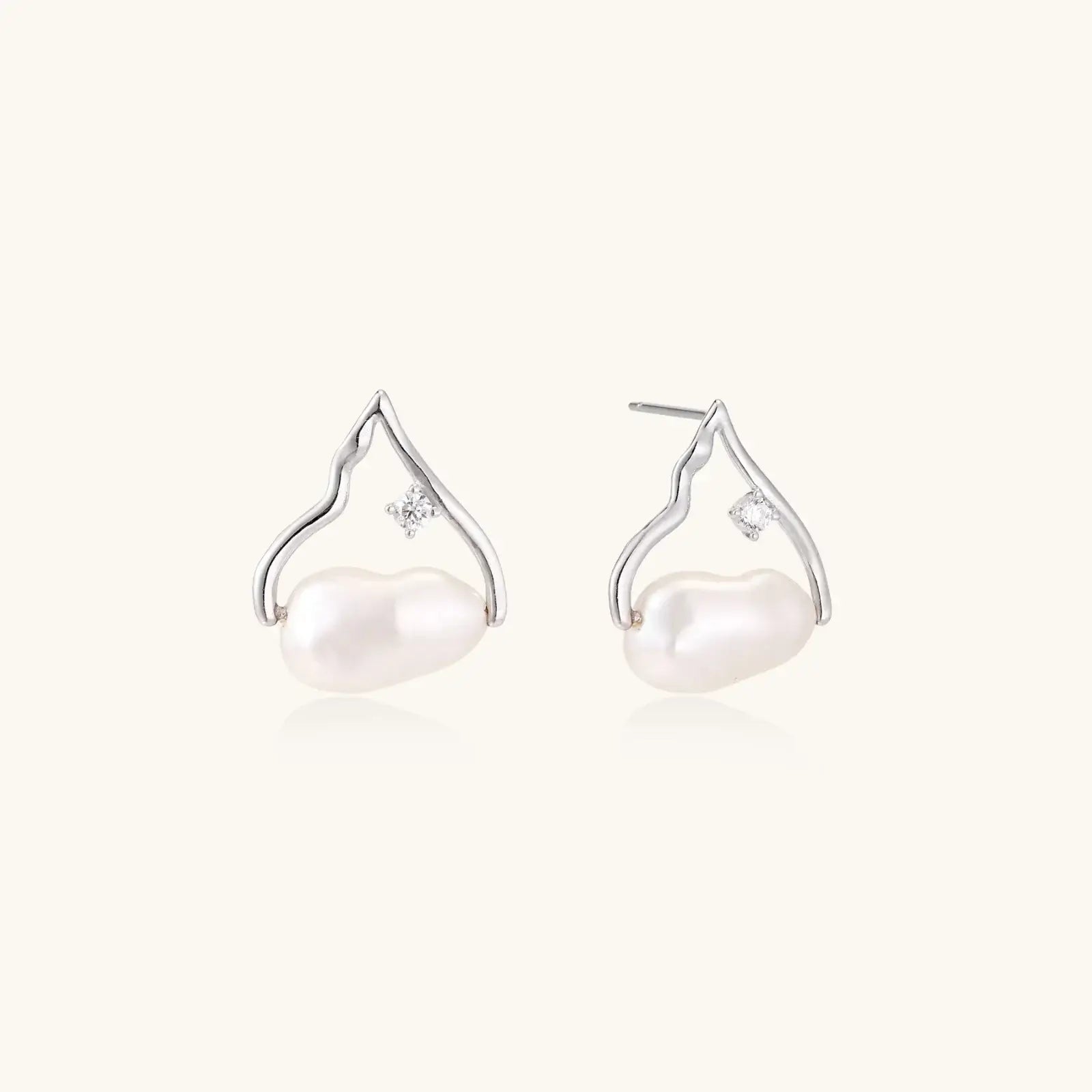 Architectural mountain silhouettes cradle lustrous baroque pearls—known for nurturing feminine energy—in these adventure-ready studs.