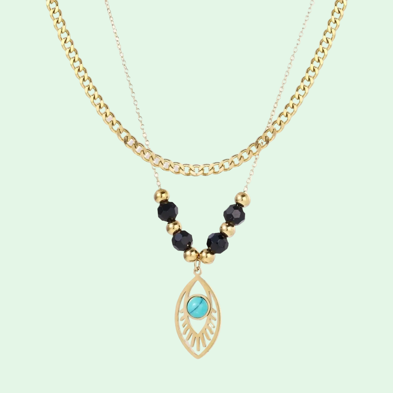 Turquoise evil eye charm—believed to ward off negativity—meets grounding black quartz beads on dual gold chains.