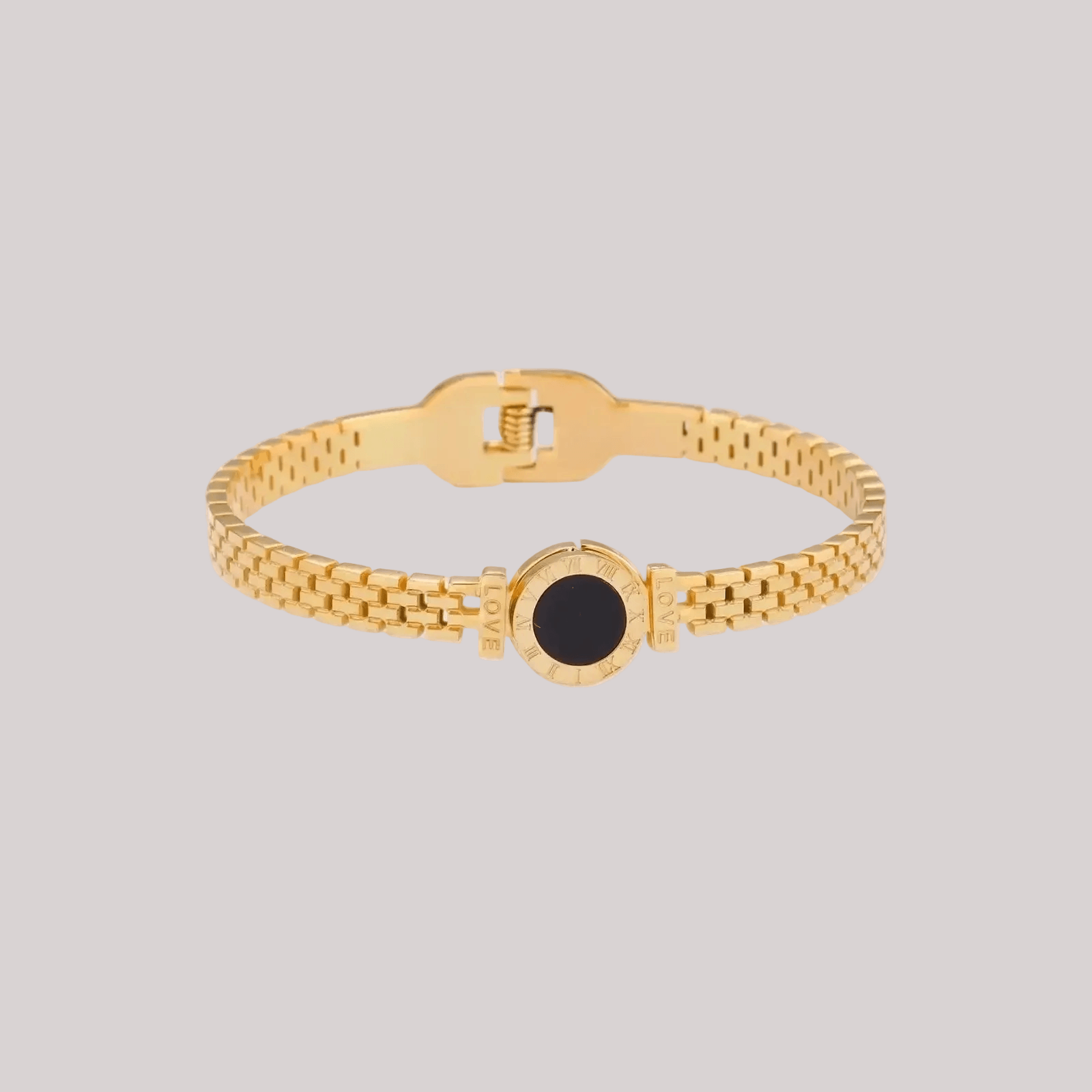 Black mother of pearl—known for nurturing feminine energy—meets Roman numeral detailing in this watch-inspired bracelet.