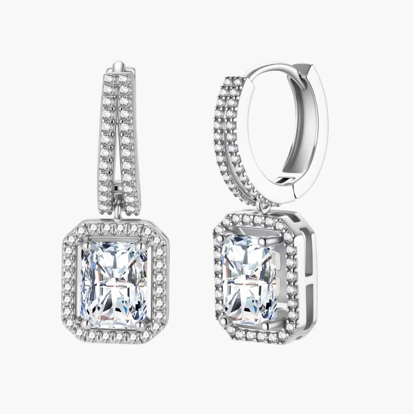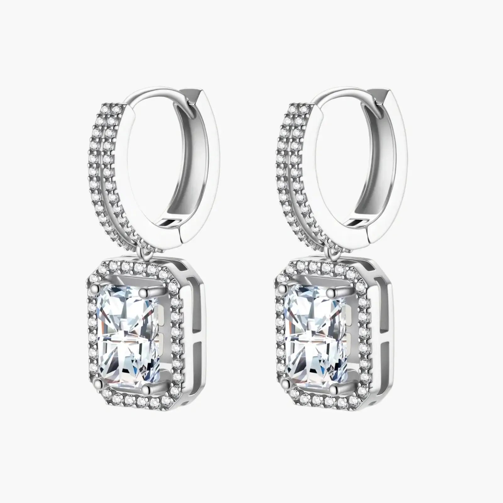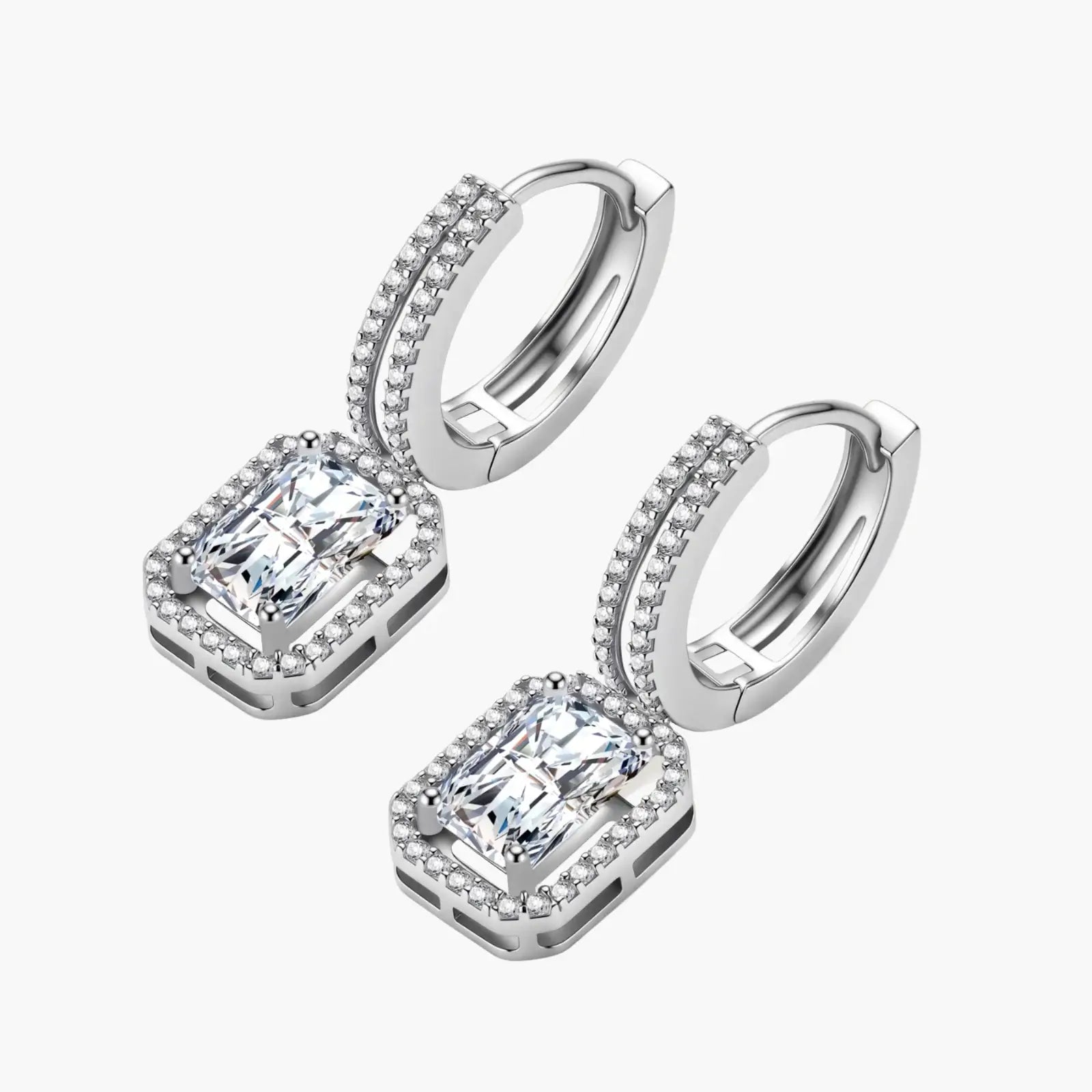 Geometric emerald-cut moissanite meets sterling silver huggie hoops in these confidence-channeling drops.