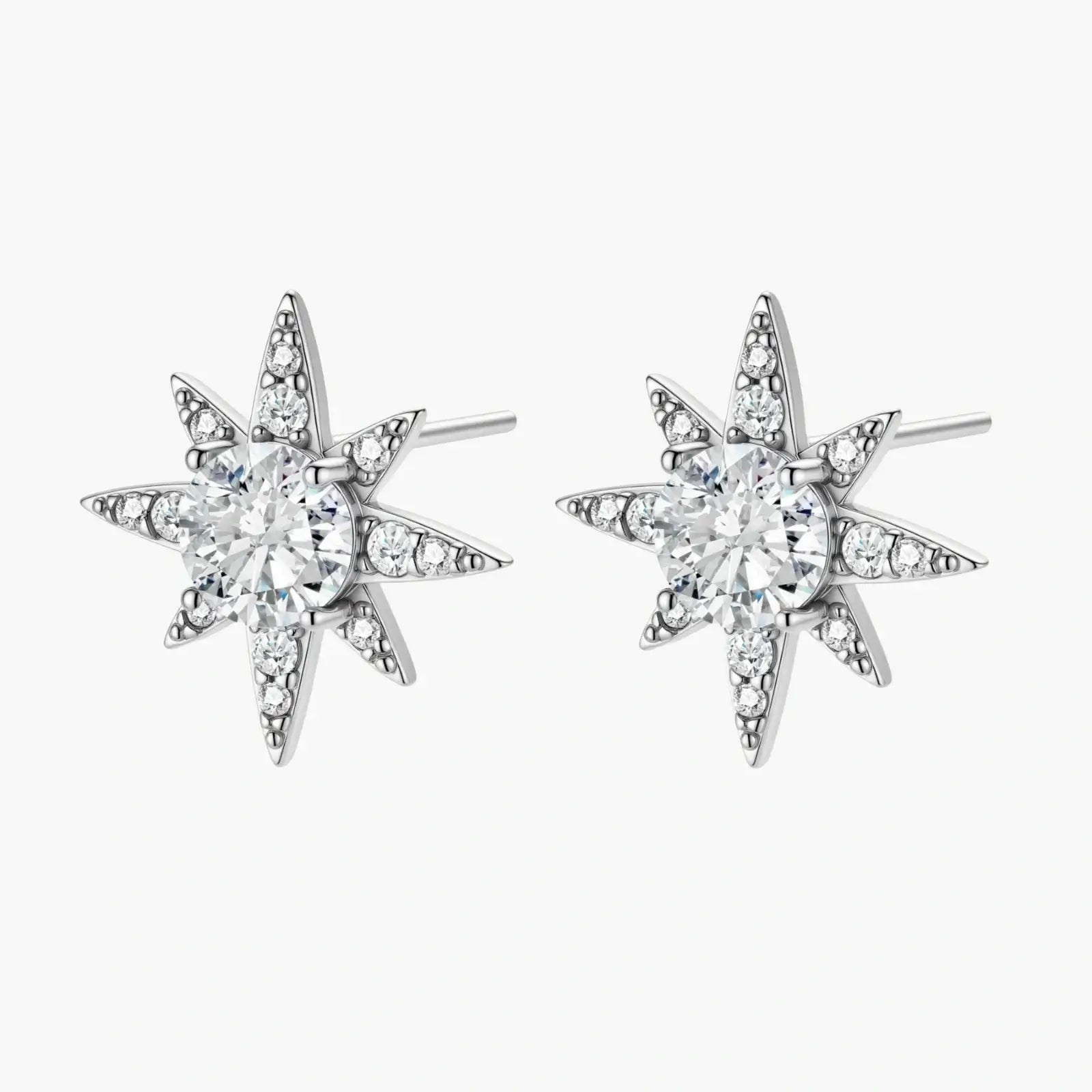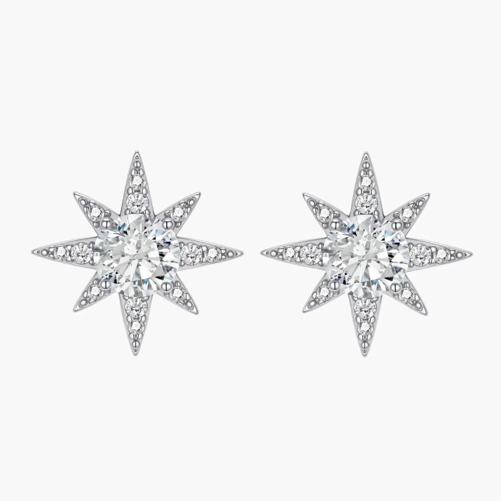 Sterling silver star-shaped stud earrings with brilliant moissanite center stones and pavé details on neutral background.