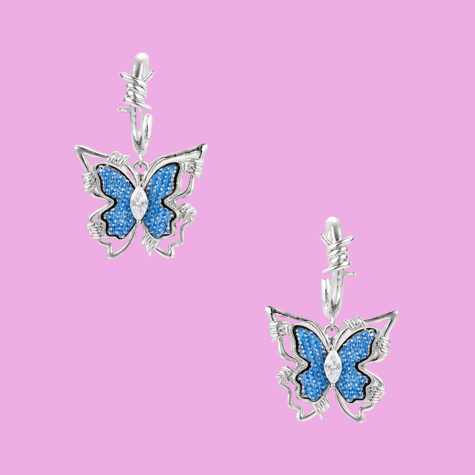 Y2K butterfly meets barbed wire edge in these denim-inlaid hoops with white gold plating.