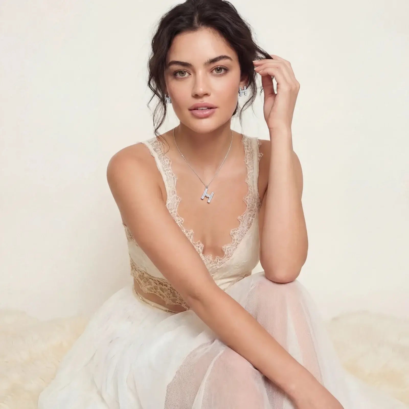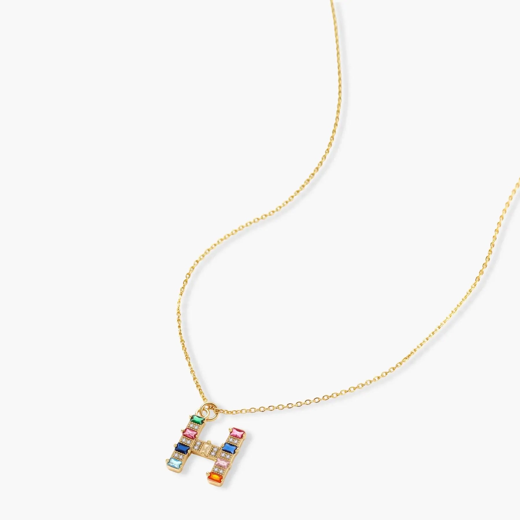 Letter H jewelry set featuring geometric crystal design in gold and white gold plated finish with adjustable chain necklace