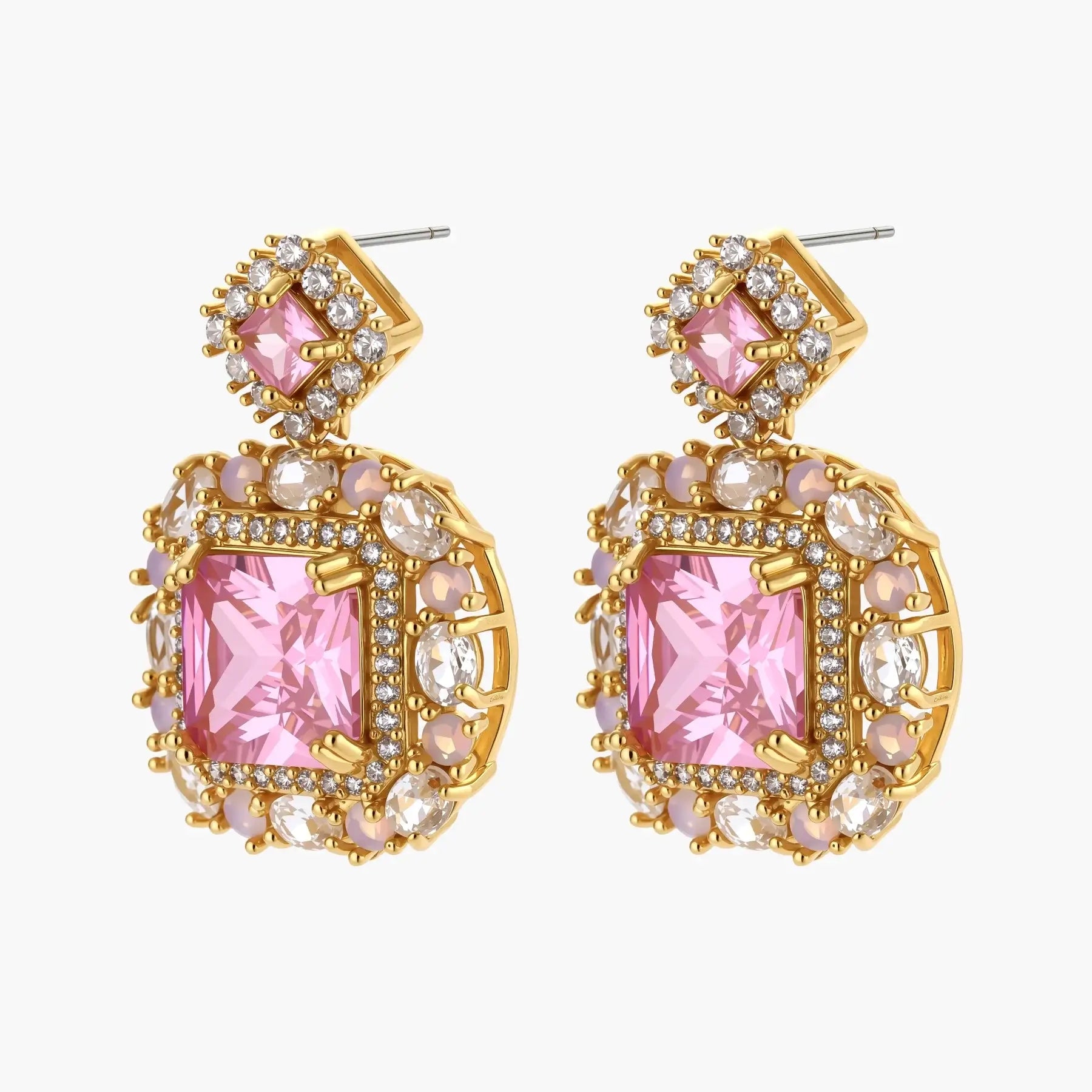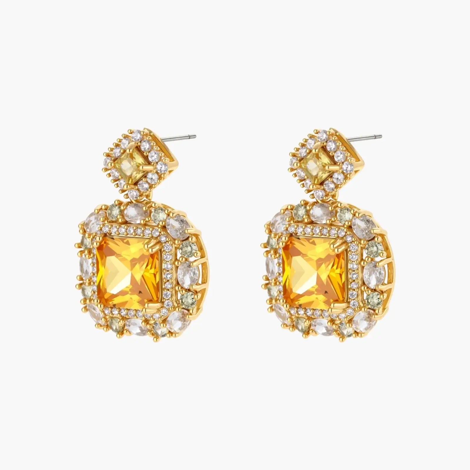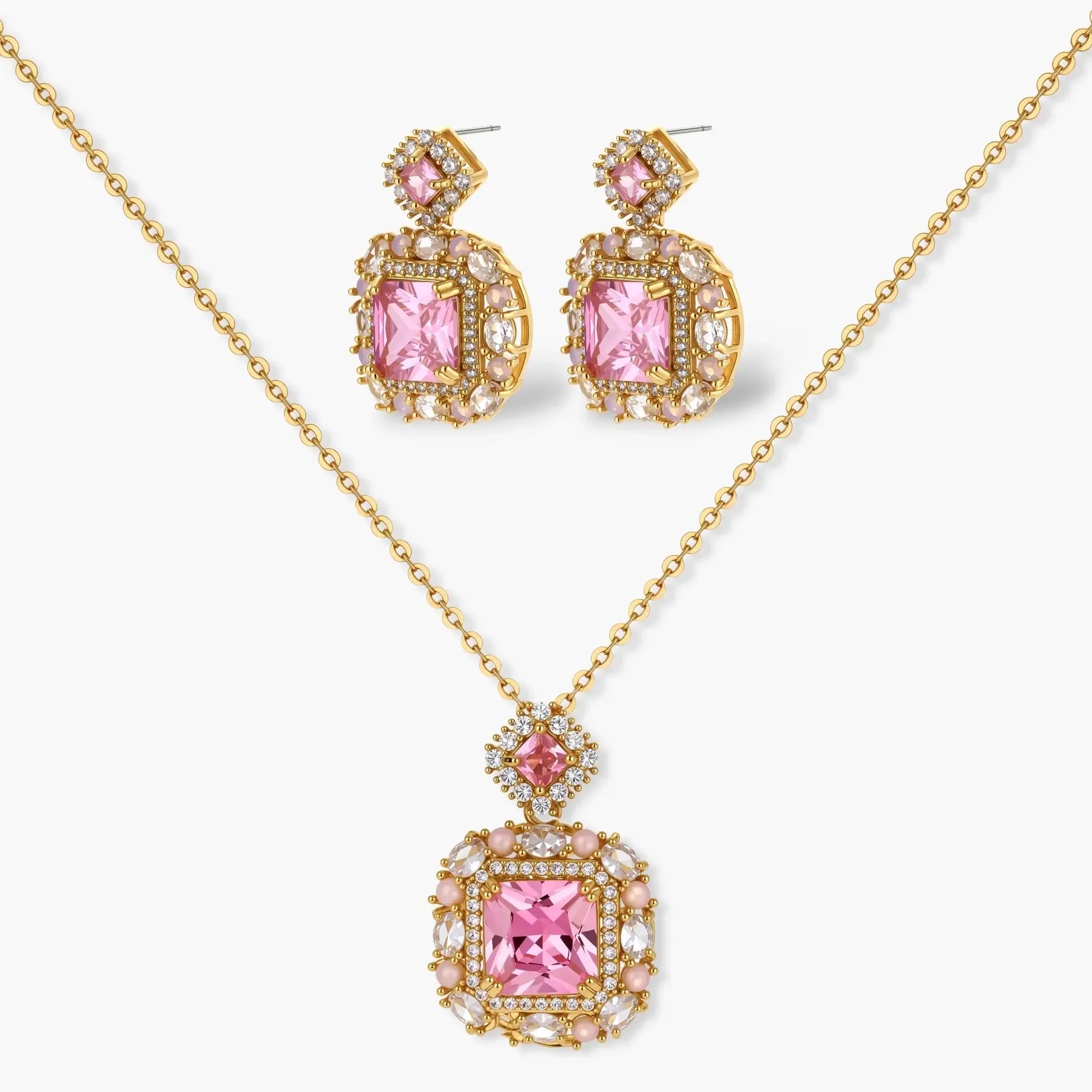 14K gold-plated jewelry set featuring square-cut cubic zirconia stones in ornate layered settings on white background.