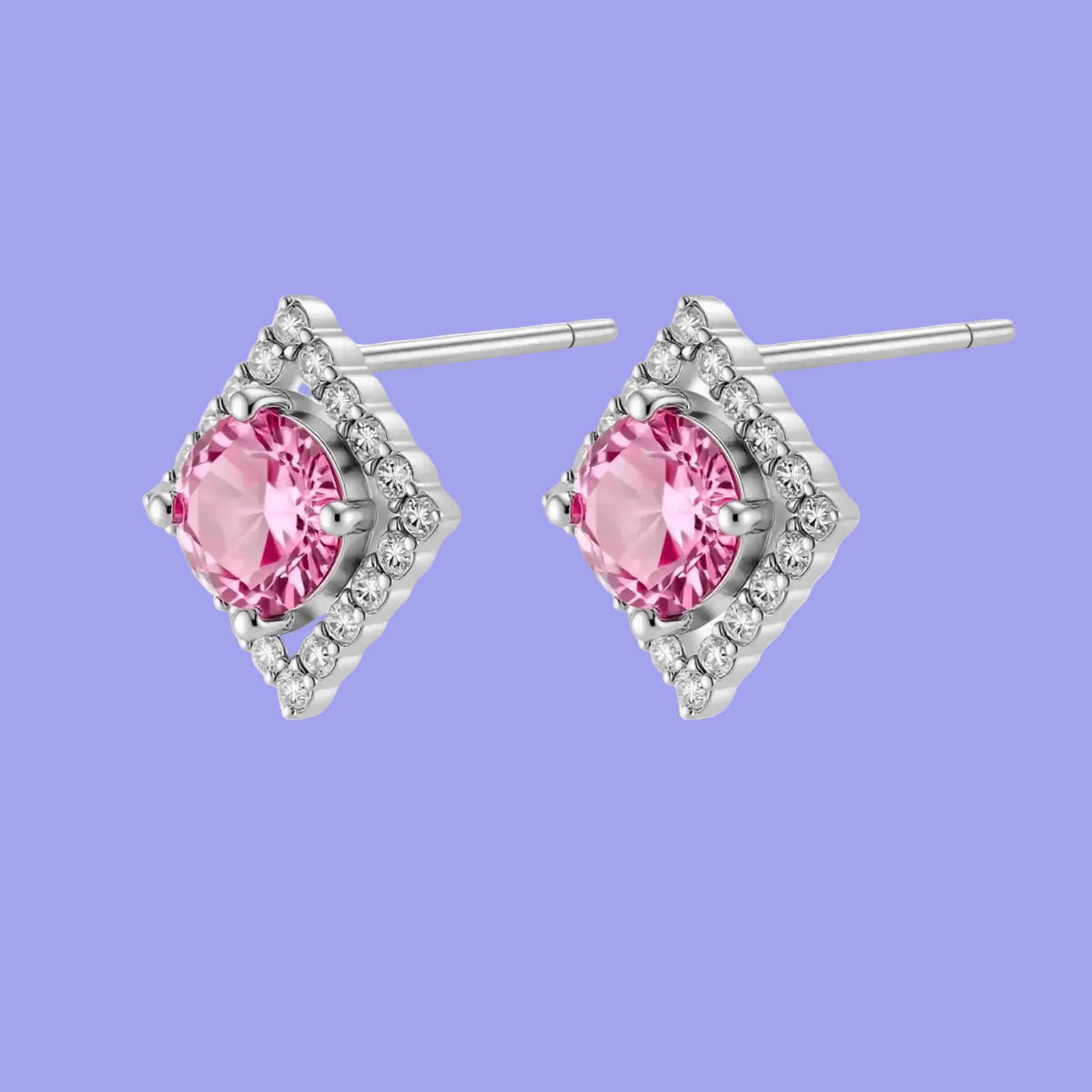 Sterling silver diamond-shaped stud earrings with pink moissanite center stones and crystal halo setting on white background