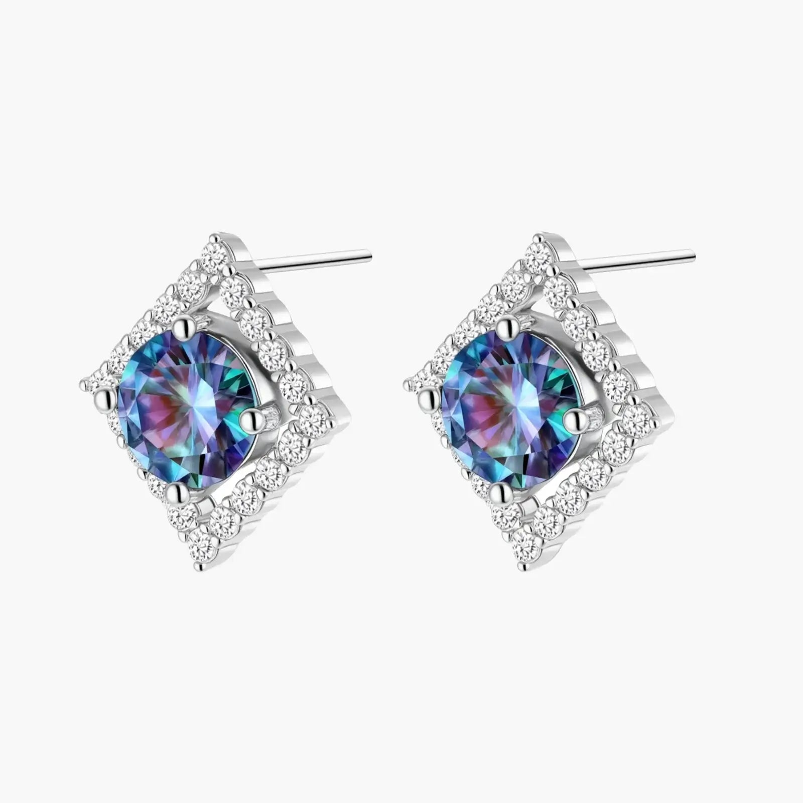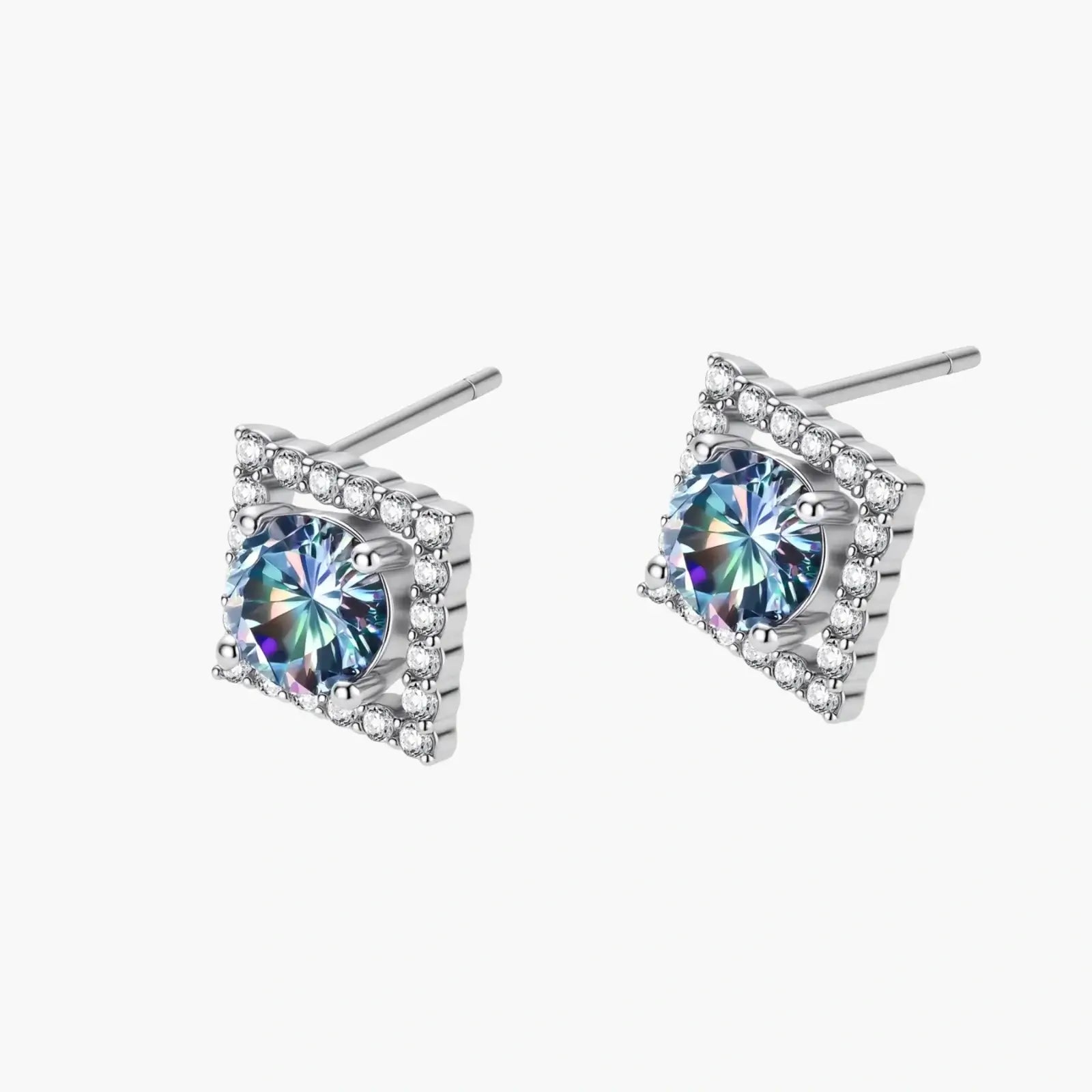 Diamond-shaped sterling silver stud earrings with rainbow moissanite centers surrounded by crystal halos
