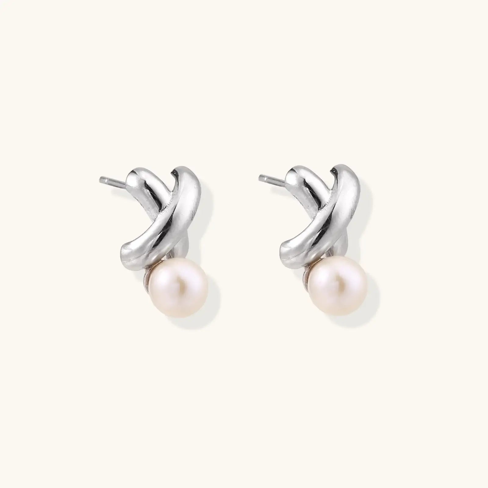 Rhodium-plated silver earrings with twisted X design and freshwater pearl drops on beige background